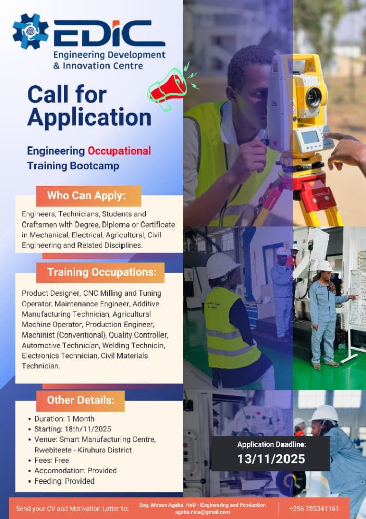 Send your CV and Motivation Letter to: Eng. Moses Agaba, Head of Department - Engineering and Production. Email: agaba.nice@gmail.com Phone: +256 785341161